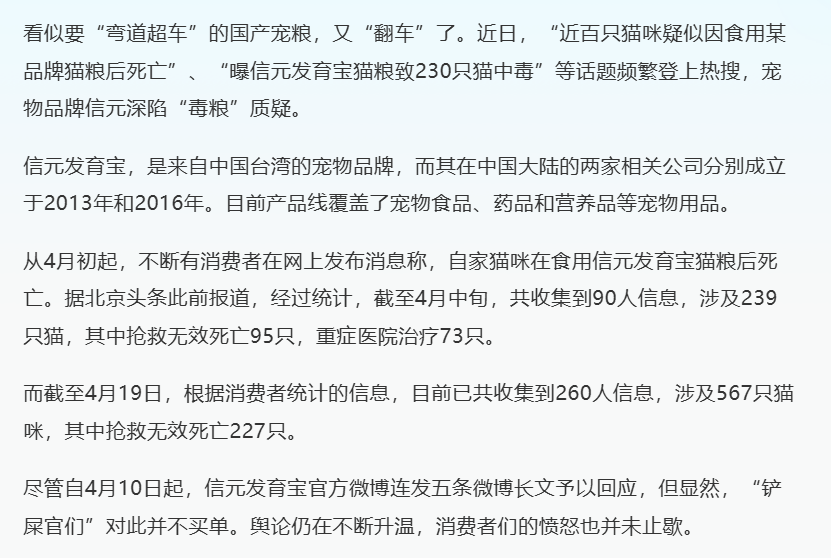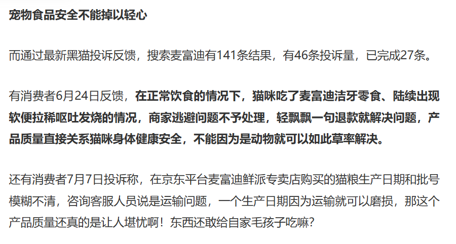 资料来源于腾讯网《乖宝宠物食品质量投诉依然密集,麦富迪以爱之名如何避免底线危机》 &澎湃新闻信元疑涉“毒猫粮”:上百只猫咪之死,能否让国产宠粮停止狂奔?